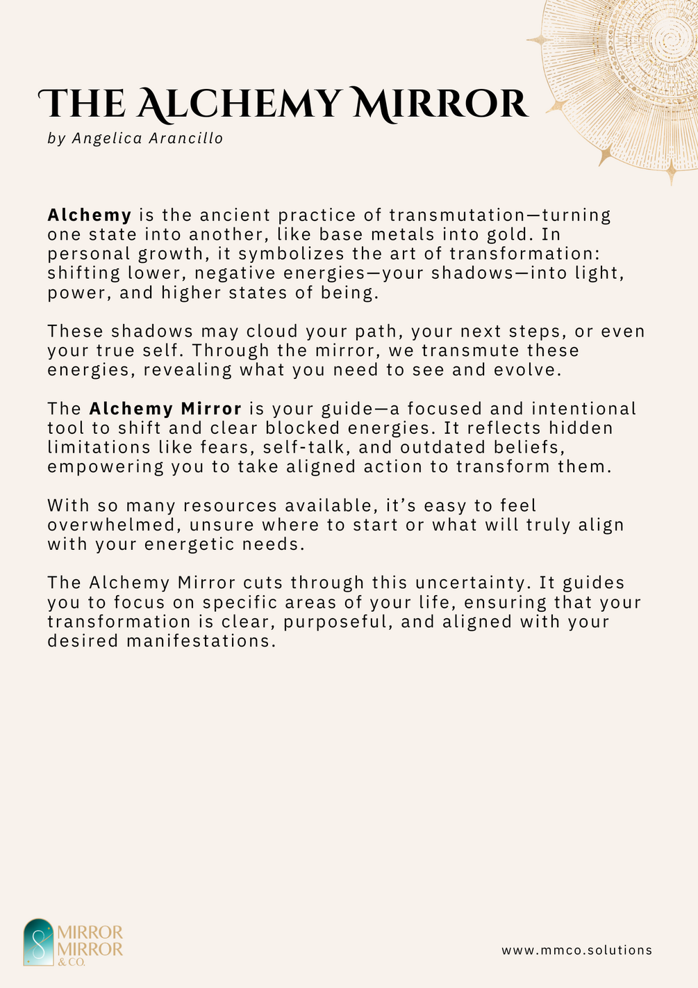 The Alchemy Mirror is your guide—a focused and intentional tool to shift and clear blocked energies. It reflects hidden limitations like fears, self-talk, and outdated beliefs, empowering you to take aligned action to transform them.